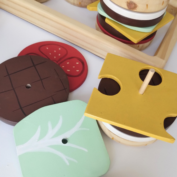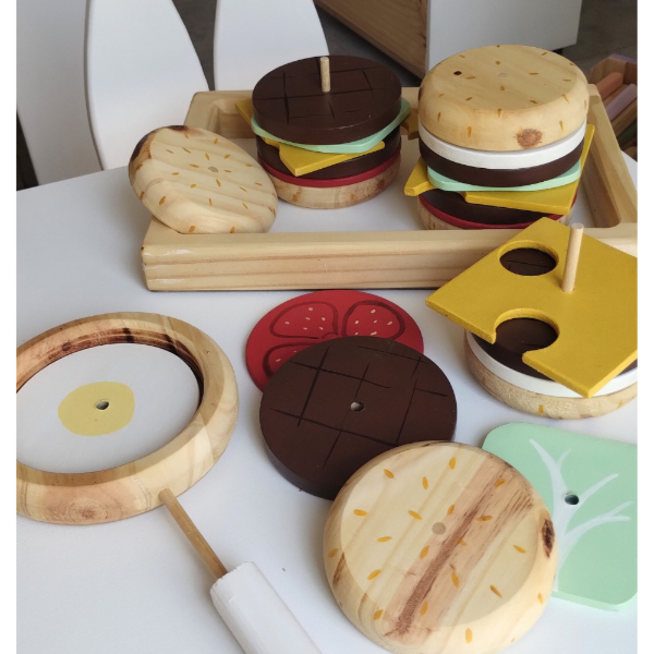 Divertida hamburguesa de encastre fabricada en madera de pino y mdf. Pintada y barnizada con productos al agua.