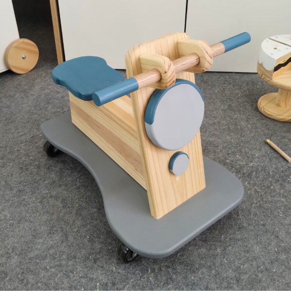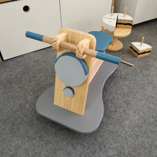 Fabricado artesanalmente en madera y con terminaciones redondeadas, combina diseño, seguridad y diversión. Su forma de moto invita al juego simbólico, fomentando la imaginación y el movimiento libre dentro o fuera de casa.