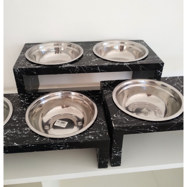 Comedero de madera en altura, pintado y barnizado con 3 capas de pintura para lograr un efecto mármol que armoniza en la decoración de tu hogar.