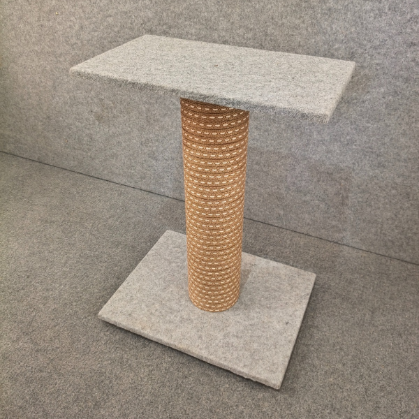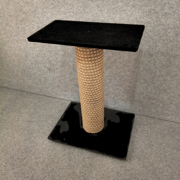 Fabricado con materiales resistentes y pensados para durar, rascador con base y estante alfombrados y su centro forrado con una hermosa cinta de yute, su estética sencilla logra integrarlo fácilmente en cualquier espacio del hogar.